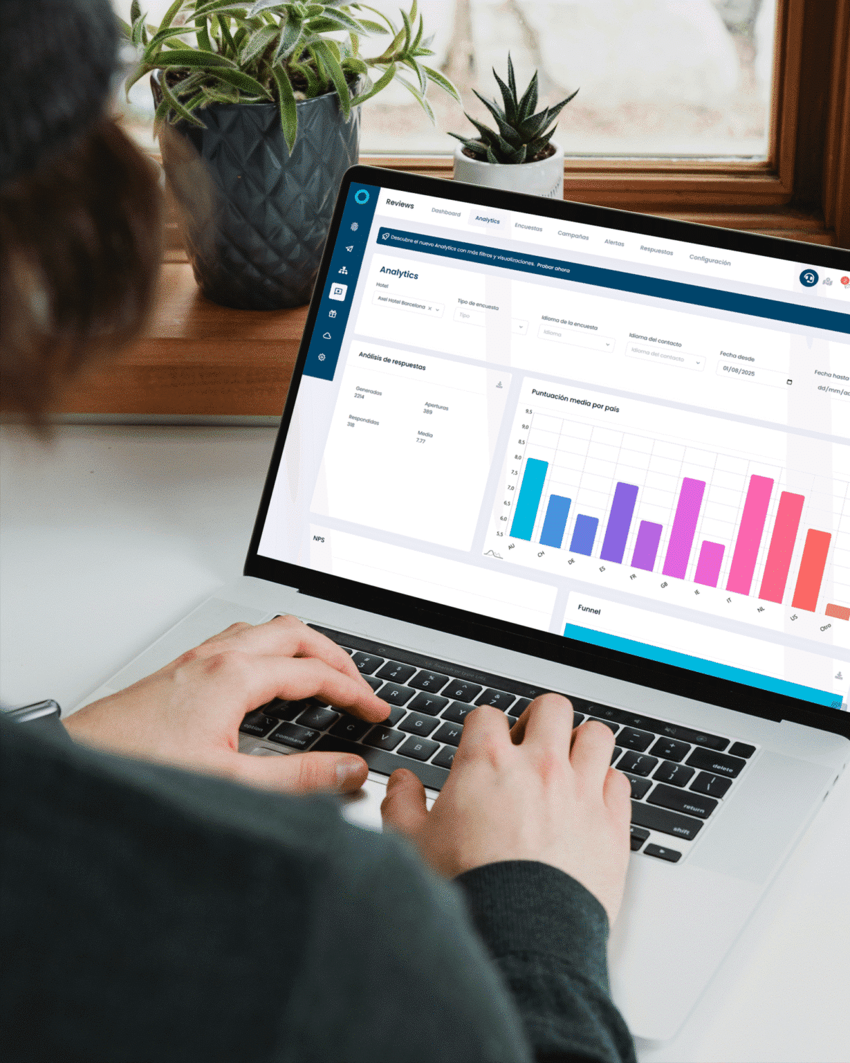 Access advanced dashboards to view satisfaction metrics, time evolution and comparisons by hotel or brand. Identify opportunities for improvement and measure the evolution of the experience.