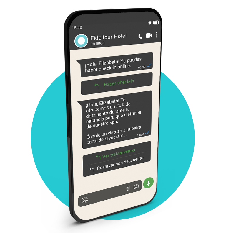 Con Fideltour CRM, la omnicanalidad hotelera se vuelve realidad: unifica datos web, email, redes y, sobre todo, WhatsApp en un mismo panel. Responde al instante, personaliza cada oferta y convierte chats en reservas directas, sin esfuerzo ni costes adicionales.